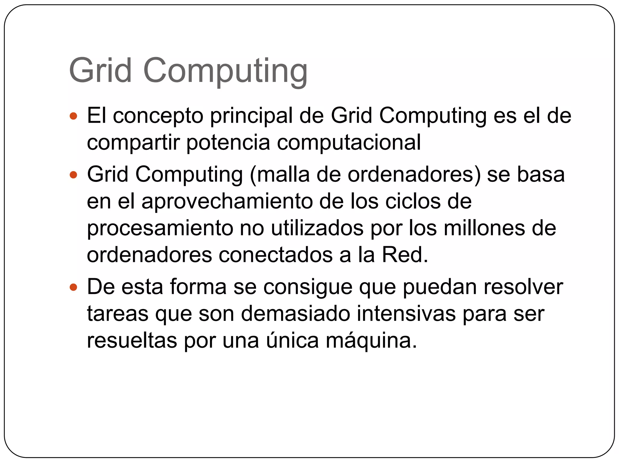 Grid computing se basa en compartir el poder computacional de millones de ordenadores conectados a la red. Esto permite resolver tareas demasiado intensivas para una sola máquina. Globus es un proyecto que desarrolla software para implementar grid computing resolviendo desafíos técnicos como la administración de recursos y datos, seguridad y desarrollo de aplicaciones.
