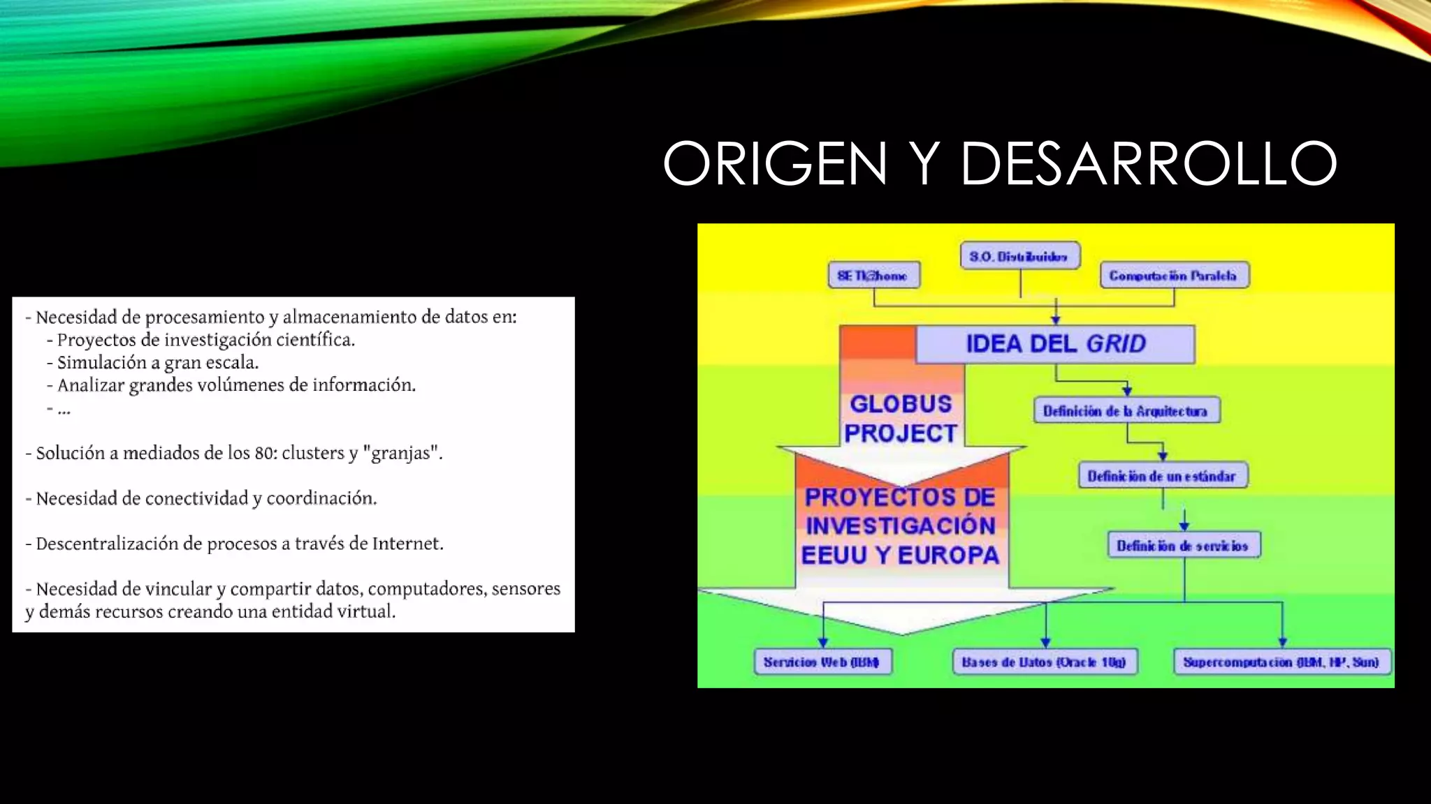El documento describe la tecnología de computación en red (grid computing), la cual permite que computadoras compartan recursos como poder de cómputo e información a través de Internet. El objetivo es utilizar recursos remotos para realizar tareas que no se podrían completar localmente. Algunas aplicaciones incluyen análisis de imágenes médicas, modelado climático, y simulaciones científicas. El middleware más popular es Globus, el cual coordina los recursos de forma segura y eficiente.