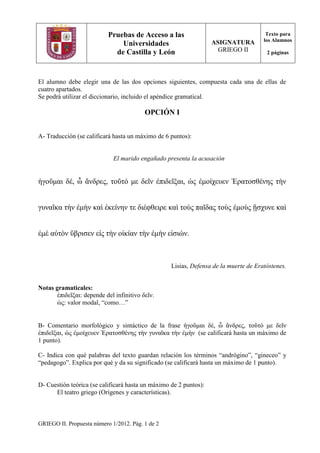 Este documento presenta dos opciones para un examen de griego clásico. Cada opción contiene cuatro apartados: A) traducción de un texto griego, B) comentario morfológico y sintáctico de una frase, C) relación de términos griegos con sus equivalentes en castellano y explicación, D) pregunta teórica sobre literatura griega antigua. La primera opción trata sobre un discurso de acusación de un marido engañado, mientras que la segunda habla de la sorpresa de Jenofonte por