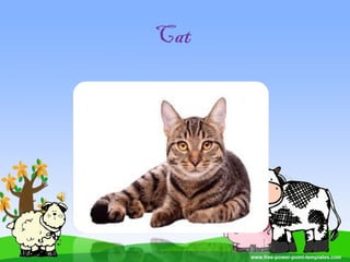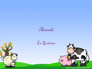 Este documento lista varios animales en gaélico irlandés, incluyendo perro, caballo, cabra, cerdo, gallina, burro, pavo y vaca.