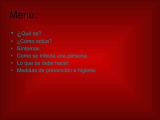 La gripe A (H1N1) de 2009 es una pandemia causada por una variante del virus de la influenza de origen porcino, afectando las vías respiratorias y presenta síntomas como fiebre, tos y dificultad para respirar. La infección se propaga a través de gotas de saliva y se recomienda consultar a un médico ante los síntomas. Las medidas de prevención incluyen lavarse las manos, ventilar espacios y mantener objetos limpios.