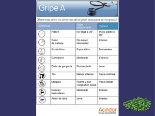 El documento proporciona respuestas a preguntas frecuentes sobre el virus de la gripe A. El virus puede vivir hasta 10 horas en superficies lisas y se transmite principalmente a través del contacto con secreciones de la nariz, boca y ojos de personas infectadas. Las medidas para prevenir el contagio incluyen lavarse las manos frecuentemente, evitar tocarse la cara y no estar cerca de personas enfermas. Las personas más susceptibles de desarrollar complicaciones graves son aquellas con sistemas inmunitarios debilitados.
