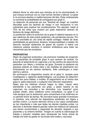 1) El autor, un médico rural, expresa su preocupación por el pánico desatado ante la epidemia de gripe A y sus consecuencias negativas para la atención a pacientes y la estructura social. 2) Señala que la gripe A es una enfermedad benigna con menor mortalidad que la gripe estacional y que las medidas de aislamiento y diagnóstico exacto son innecesarias. 3) Hace una serie de propuestas para enfrentar la epidemia con lógica y sentido común en lugar de promover el pánico.