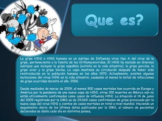La gripe H1N1 es un subtipo de influenza A que se propaga fácilmente entre humanos. Causa síntomas similares a la gripe estacional como fiebre, tos y dolor de garganta. Las personas más susceptibles son los jóvenes, embarazadas y aquellos con condiciones médicas subyacentes. Aunque la mayoría se recuperan sin complicaciones, en algunos casos puede provocar neumonía u otras complicaciones respiratorias graves.