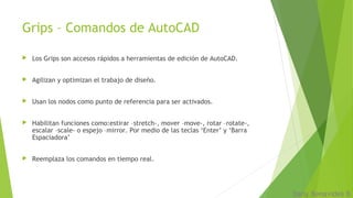 Este documento describe los Grips de AutoCAD, herramientas que agilizan el trabajo de diseño al permitir editar objetos mediante nodos de referencia. Los Grips habilitan funciones como estirar, mover, rotar, escalar u obtener espejos de objetos seleccionados usando las teclas Enter o barra espaciadora. El documento incluye un ejemplo del uso de los Grips y referencias para más información.