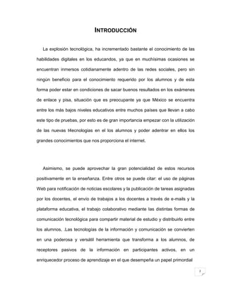 El documento aborda la importancia de motivar a los alumnos mediante el uso de tecnologías de la información y la comunicación (TIC) en la educación, especialmente en la asignatura de formación cívica y ética. Se propone el uso de recursos como webquests para mejorar el aprendizaje, personalizar la educación y facilitar la comunicación. El objetivo es integrar de manera efectiva las TIC en el aula, superando las limitaciones actuales y preparando a los estudiantes para un aprendizaje más dinámico y significativo.