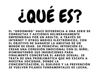 El documento define el grooming como una serie de acciones deliberadas emprendidas por un adulto a través de internet y otros medios electrónicos con el objetivo de ganarse la amistad de un menor de edad y crear una conexión emocional para eventualmente abusar sexualmente. Explica que las características principales son el engaño inicial del adulto hacia el menor, la intención de obtener una relación de control emocional para satisfacción sexual, y el uso de dispositivos tecnológicos. Finalmente, recomienda medidas como controlar el acceso
