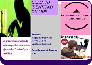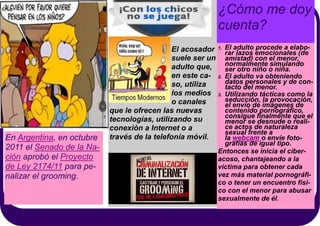 El documento describe el grooming o acoso cibernético de menores. Explica que un adulto establece un vínculo emocional con un menor simulando ser otro niño o niña para obtener información personal. Luego usa tácticas como seducción o envío de imágenes pornográficas para que el menor realice actos sexuales frente a la cámara o envíe fotos, con el fin de chantajearlo para conseguir más material o un encuentro físico para abusar del menor.