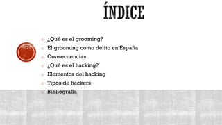 El documento habla sobre el grooming y el hacking. Explica que el grooming implica que un adulto gane la confianza de un menor a través de Internet con el fin de abusar sexualmente de él, lo que puede tener graves consecuencias psicológicas y de otro tipo para la víctima. También define el hacking como acceder ilegalmente a un sistema informático vulnerando las medidas de seguridad, y explica que existen diferentes tipos de hackers con distintos objetivos y métodos.