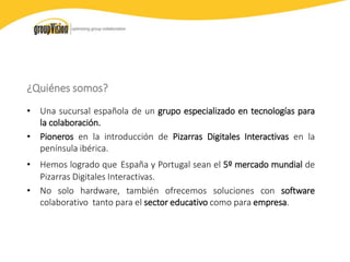 Groupvision Distribution Services es una empresa española especializada en tecnologías de colaboración, pionera en pizarras digitales interactivas en la península ibérica. Ofrecen una gama de productos y soluciones que incluyen hardware, software colaborativo y soporte técnico para educación y empresas. Además, cuentan con showroom, marketing especializado y asistencia técnica para maximizar el uso de sus tecnologías.