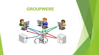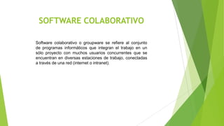 El software colaborativo o groupware se refiere a programas que permiten que múltiples usuarios trabajen en un mismo proyecto de forma concurrente desde diferentes estaciones de trabajo conectadas a través de una red. El groupware incluye herramientas de comunicación, conferencia y gestión que facilitan la colaboración entre los miembros de un equipo de forma asíncrona o síncrona. Algunos beneficios del groupware son que estimula la cooperación, ayuda a la comunicación y coordinación de proyectos compartidos, y proporciona una forma de compart
