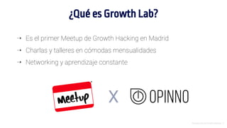Este documento presenta una introducción al concepto de growth hacking. Explica que Growth Lab es el primer Meetup de growth hacking en Madrid, con charlas y talleres mensuales. También define qué es growth hacking, resumiendo su origen, fases de una startup, cómo funciona en una organización, y el perfil de un growth hacker. Finalmente, presenta algunas herramientas comunes usadas en growth hacking.