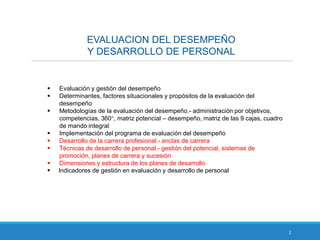 El documento proporciona una introducción a la evaluación del desempeño y desarrollo de personal. Explica conceptos clave como desempeño, mérito, rendimiento y competencia. Luego describe diferentes metodologías de evaluación del desempeño como la administración por objetivos, evaluaciones de 360 grados y matrices. Finalmente, cubre temas como factores que afectan el desempeño, propósitos de la evaluación y ejemplos de su implementación usando la metodología de administración por objetivos.