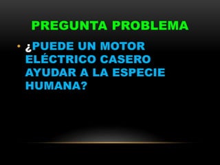Este documento describe la fabricación de un motor eléctrico casero. Su objetivo general es comprender los circuitos eléctricos y motores, mientras que el objetivo específico es realizar un motor eléctrico casero de bajo costo para satisfacer las necesidades humanas. Explica brevemente cómo funcionan los motores eléctricos convirtiendo energía eléctrica en mecánica. Luego, detalla los materiales y pasos necesarios para construir un motor eléctrico casero simple utilizando palos de balsa, tornillos,