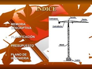 Este documento presenta un proyecto para construir una maqueta de una grúa de construcción utilizando canutillo de papel. Incluye una memoria descriptiva, una planificación con tareas y materiales, un presupuesto y un plano de ingeniería. El objetivo es estudiar los principios estructurales mediante la construcción de la maqueta, la cual consiste en una torre, una pluma y contrapesos unidos por tirantes para soportar esfuerzos.