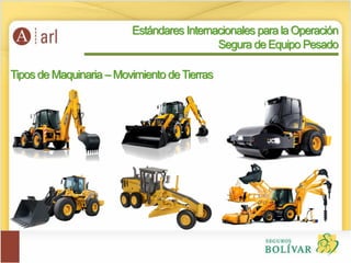 El documento presenta información sobre estándares internacionales para la operación segura de equipo pesado. Describe diferentes tipos de maquinaria, normas de organizaciones como ASME y ANSI, y requisitos para operadores de grúas según la norma ASME B30.5. Además, aborda temas como la gestión de riesgos, con enfoque en la empresa, el equipo y el personal involucrado, así como aspectos de seguimiento y verificación.