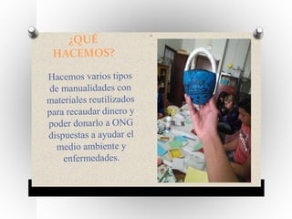El documento presenta los proyectos manuales realizados por el Grupo 6a para recaudar fondos de manera solidaria. Crearon cajas de jabón, huchas de diferentes formas e imanes utilizando materiales reciclables como bricks de leche y rollos de papel. También asistieron a dos proyectos secundarios donde hicieron instrumentos musicales con tubos de cartón y arroz, y flores para un jardín vertical.