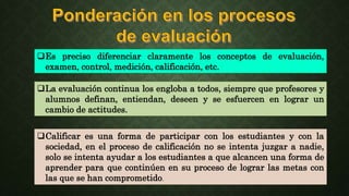 El documento presenta una especialización en docencia superior enfocada en el sistema de evaluación de la educación, subrayando la importancia de diferenciar entre conceptos como evaluación, examen y calificación. Destaca que la evaluación continua implica un esfuerzo conjunto de profesores y alumnos para fomentar el cambio de actitudes y se vincula a la calidad y productividad en la educación superior. Además, se identifican factores que influyen en la calidad docente, incluyendo enfoques sistémicos y sociotécnicos que consideran tanto los elementos tecnológicos como las relaciones sociales en el proceso educativo.