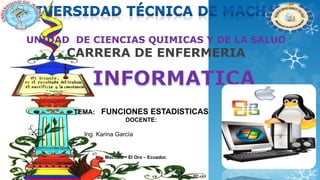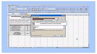 Este documento describe varias funciones estadísticas en Excel como CONTAR, CONTARA, CONTAR.SI, MAX, MIN, MEDIANA, MODA y BUSCAR. Explica la sintaxis y uso de cada función, así como ejemplos para contar celdas con números, encontrar el valor máximo o mínimo, calcular la mediana y moda de un conjunto de datos, y buscar valores dentro de un rango.