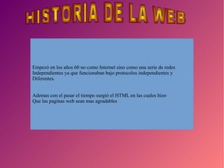 El documento describe la evolución de la web desde sus inicios hasta la visión de la web 4.0. Comenzó en los años 60 como redes independientes y desconectadas, y el HTML hizo que las páginas sean más agradables. La web 1.0 consistió en documentos HTML interconectados, mientras que la web 2.0 permitió que las personas se conecten entre sí y compartan información en redes sociales y wikis. La web 3.0 usa inteligencia artificial para que las aplicaciones se comuniquen entre sí. La web 4.0 pretende que