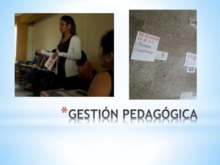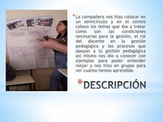 La compañera presentó los temas de la gestión pedagógica, el rol del docente, y los procesos que apoyan la gestión. Explicó las condiciones necesarias como el clima escolar, trabajo en equipo y atención a los objetivos para crear un ambiente que beneficie el aprendizaje de los alumnos. También usó ejemplos para ilustrar los conceptos y puso a los estudiantes en grupos para evaluar su comprensión.
