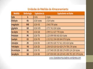 El documento describe diferentes tipos y unidades de medida de almacenamiento de información, así como diferentes tipos de computadoras como mainframes, minicomputadoras, microcomputadoras y servidores. Define unidades como bits, bytes, kilobytes, megabytes, gigabytes y más. Explica las características y usos de cada tipo de computadora.