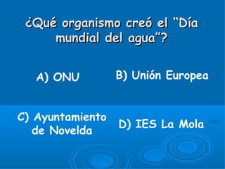 El documento contiene 5 preguntas de selección múltiple sobre temas relacionados con el agua y el medio ambiente. Las preguntas tratan sobre quién creó el Día Mundial del Agua, en qué año se estableció el protocolo de Kioto, cuánta agua gasta una persona en los países desarrollados al día, cuántos litros de agua se pueden ahorrar con una ducha rápida en lugar de un baño, y en qué actividad doméstica se gasta más agua.