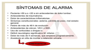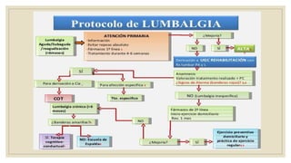 Este documento presenta información sobre la lumbalgia. En primer lugar, define la lumbalgia como dolor localizado en la parte baja de la espalda. Luego, describe las diferencias entre lumbago y ciática, indicando que el lumbago se refiere al dolor en la parte baja de la espalda mientras que la ciática implica dolor, debilidad o entumecimiento en la pierna. A continuación, detalla algunas de las causas más comunes de lumbalgia como mala postura, movimientos repentinos o sobrepeso. Finalmente, resume algunas opcion