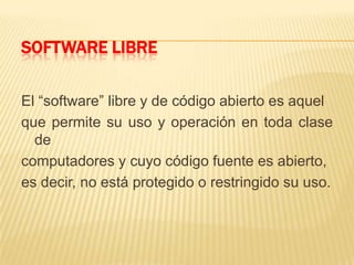 El documento resume las características y tipos de software libre y de código abierto, incluyendo que permite la ejecución, estudio, distribución y mejora del programa sin restricciones. Explica la diferencia entre software comercial, shareware y freeware, y conceptos como copyleft y copyright. También resume un proyecto de ley colombiano para promover el uso de software libre.