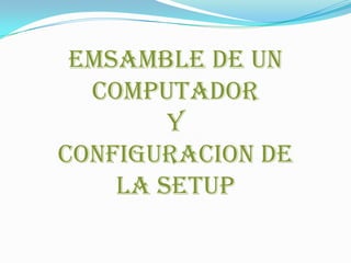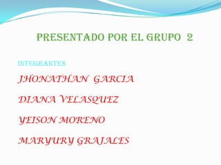 El documento presenta los 7 pasos para ensamblar un computador, incluyendo la tarjeta madre, fuente de poder, procesador con disipador, unidad de disco duro, unidad de DVD, unidad de disquete, memoria RAM y conector IDE. Los integrantes del grupo 2, Jhonathan García, Diana Velásquez, Yeison Moreno y Maryury Grajales, describen la configuración básica de un computador y el orden para ensamblar sus componentes.
