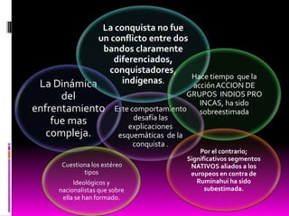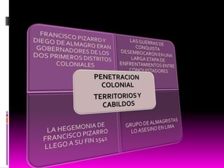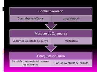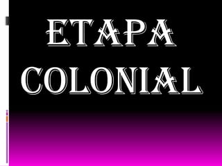 El documento resume la etapa colonial en Ecuador desde la invasión española hasta la consolidación del régimen colonial. Los conquistadores sometieron a las sociedades indígenas y establecieron el control español. La reforma de Toledo en 1569-1581 fue clave para la explotación de los indígenas a través de la mita y las reducciones. Esto marcó la transición al mandato colonial indirecto y la consolidación del imperio en el virreinato del Perú y la audiencia de Quito.