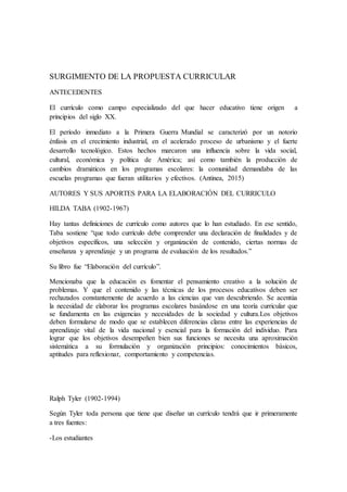 El documento resume los orígenes y desarrollo del currículo como campo de estudio. Explica que surgió a principios del siglo XX en respuesta a las demandas de la sociedad por programas escolares más prácticos. Luego describe las contribuciones de autores clave como Hilda Taba, Ralph Tyler y Bowles y Gintis, y los diferentes enfoques del currículo a través de la historia. Finalmente, resume los objetivos de una nueva propuesta curricular centrada en el aprendizaje de los estudiantes.