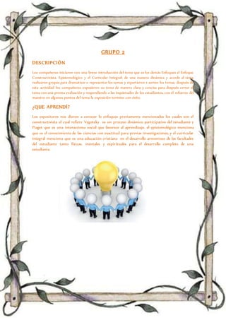 El grupo presentó brevemente tres enfoques pedagógicos: el constructivista, el cual se enfoca en el aprendizaje dinámico y participativo del estudiante a través de la interacción social; el enfoque epistemológico, que considera el conocimiento científico obtenido a través de investigaciones previas; y el enfoque curricular integral, el cual propone una educación que promueva el desarrollo armonioso de las capacidades físicas, mentales y espirituales del estudiante. Los compañeros dramatizaron