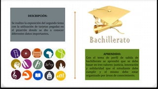 El documento presenta el segundo tema de un perfil de salida del bachillerato. Se expuso el tema utilizando tarjetas en el pizarrón con datos importantes. Se aprendió que el perfil de salida debe basarse en tres valores - justicia, innovación y solidaridad - y debe estar organizado por áreas de conocimiento para que los estudiantes los cumplan.