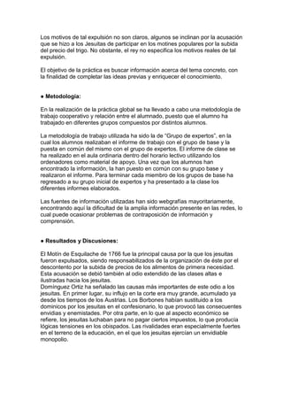 El documento describe un proyecto realizado por estudiantes de magisterio sobre la educación y la ilustración en España. Los estudiantes trabajaron en grupos para investigar diferentes temas relacionados y luego compartieron información. El proyecto utilizó una metodología de "grupos de expertos" donde los estudiantes primero investigaron individualmente y luego colaboraron con otros para crear un informe final. El informe final cubrió temas como la expulsión de los jesuitas por Carlos III en 1767 y sus consecuencias en la educación y cultura espa
