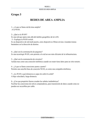 Este documento describe las redes de área amplia (WAN) y sus características principales. Una WAN opera a distancias geográficas mayores que una LAN y utiliza técnicas como la conmutación de paquetes y circuitos, así como conexiones punto a punto, para transmitir señales a baja velocidad y largas distancias. Las señales inalámbricas facilitan las conexiones de red cuando los dispositivos no pueden conectarse por cable.