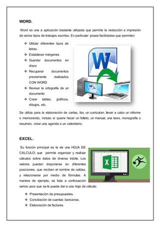 Este documento describe varias herramientas ofimáticas y documentos web utilizados para la educación, incluyendo Word para la redacción de documentos, Excel para hojas de cálculo, PowerPoint para presentaciones, Access para bases de datos, YouTube y Google Drive para almacenamiento de archivos, Google Search para búsqueda en internet, WordPress para blogs, Dropbox y SkyDrive para almacenamiento en la nube, Wikipedia como enciclopedia en línea, SlideShare para compartir presentaciones, Prezi como herramienta de presentaciones alternativa, Facebook para comunicación y Blogger como pl
