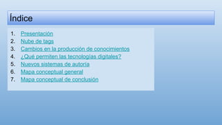 El documento aborda la integración de nuevas tecnologías educativas y su impacto en la producción de conocimiento, destacando la transición de sistemas de conocimiento tradicional a formas de conocimiento colectivo. Se enfatiza la importancia de que los docentes comprendan estas tecnologías para guiar a los alumnos de manera efectiva. La obra concluye subrayando el valor de la colaboración y la participación en el proceso educativo moderno.