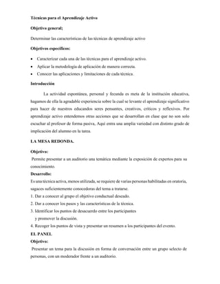 Este documento presenta varias técnicas para el aprendizaje activo como la mesa redonda, el panel, el simposio, el debate, el sociodrama, el juego de roles, la lluvia de ideas y el afiche. Describe los objetivos, desarrollo y recomendaciones para aplicar cada técnica de manera efectiva. El documento busca determinar las características de estas técnicas para promover un aprendizaje significativo en los estudiantes.