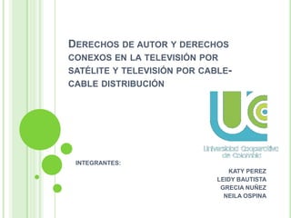 El documento detalla los derechos de autor y derechos conexos en la televisión por satélite y cable, destacando la distinción entre derechos morales y patrimoniales, así como sus implicaciones en la transmisión y reproducción de obras. Se mencionan convenios internacionales relevantes como el Convenio de Berna, Convenio de Roma y la Ley 182 de 1995 en Colombia, que regulan cómo se protegen estos derechos. También se discuten las implicaciones del uso del espectro electromagnético en la distribución de señales de televisión, diferenciando entre señales incidentales y codificadas.