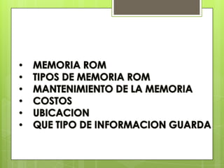 La memoria ROM almacena programas de forma permanente y se utiliza para guardar los programas básicos necesarios para el arranque del sistema. Puede ser programada una sola vez y luego solo permite lectura de datos. La memoria EEPROM puede ser borrada y reprogramada eléctricamente y la memoria flash es una forma avanzada de EEPROM que permite borrar y reescribir múltiples posiciones de memoria.
