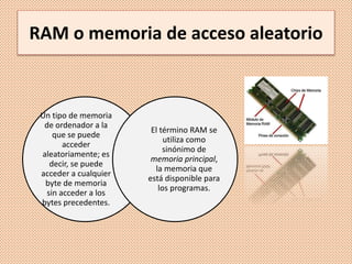 El documento describe las diferencias entre la memoria RAM y ROM. La memoria RAM permite el acceso aleatorio a los bytes de memoria y se utiliza como memoria principal para los programas, mientras que la memoria ROM almacena información de forma permanente como el firmware y solo permite la lectura de datos. El documento también explica el funcionamiento y tipos de ambas memorias como DRAM, SRAM, ROM, PROM, EPROM y memoria flash.