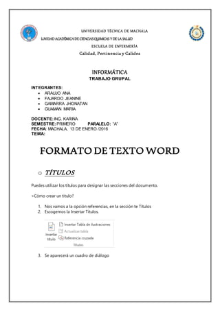El documento proporciona instrucciones sobre cómo aplicar varios formatos de texto en Microsoft Word, incluyendo cómo crear títulos, alinear y justificar texto, aplicar sangrías, viñetas y numeración, personalizar el fondo, insertar letras capitales, agregar columnas y marcas de agua.