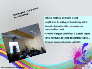 El documento habla sobre estrategias educativas para facilitar el aprendizaje de estudiantes con necesidades especiales de apoyo. Estas estrategias incluyen modificaciones curriculares de diferentes niveles e involucran a orientadores, profesores de pedagogía terapéutica y del programa de compensatoria. La adaptación curricular considera datos del estudiante, su nivel académico, estilo de aprendizaje, objetivos, contenidos y criterios de evaluación modificados.
