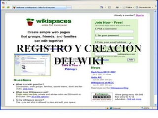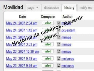 El documento describe las funciones básicas de un wiki como Wikispaces. Permite crear y editar páginas, añadir imágenes, enlaces y otros elementos multimedia. Los usuarios pueden ver la historia de ediciones de cada página y comentarlas. Un wiki facilita la colaboración y el trabajo en grupo de forma flexible.