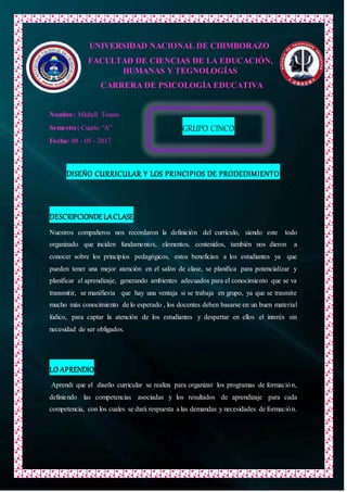 El resumen describe un documento sobre el diseño curricular y los principios de procedimiento. Explica que el currículo incluye fundamentos, elementos y contenidos que benefician a los estudiantes al proporcionar una mejor atención en el aula. También señala que al planificar el aprendizaje y generar ambientes adecuados, se transmite más conocimiento del esperado, especialmente si se trabaja en grupo. Además, los docentes deben utilizar materiales lúdicos para captar la atención de los estudiantes y despertar su interés.