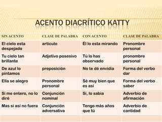 Este documento presenta información sobre el acento diacrítico en palabras monosílabas. Explica las diferencias entre palabras sin acento como "de" y "mi" y sus formas acentuadas como "dé" y "mí". También discute casos especiales de acentuación en pronombres interrogativos, demostrativos y las palabras "sólo" y "ó". El propósito es distinguir entre palabras con significados diferentes según su acentuación.