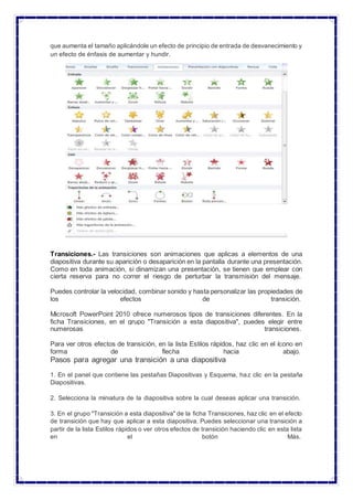 El documento proporciona información sobre animaciones y transiciones en PowerPoint. Explica que las animaciones enfocan la atención en puntos clave y controlan el flujo de información, mientras que las transiciones son animaciones que ocurren entre diapositivas. Describe cuatro tipos de efectos de animación y varios tipos de transiciones disponibles, y proporciona pasos para agregar animaciones y transiciones a diapositivas. También incluye consejos sobre el uso de animaciones, transiciones, texto, imágenes y otras características en