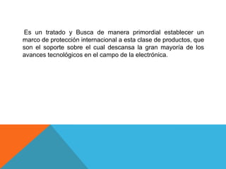 Este documento trata sobre el Tratado de Washington de 1989, cuyo objetivo es establecer un marco de protección internacional para los circuitos integrados. Define los circuitos integrados como pequeñas pastillas de material semiconductor con circuitos electrónicos fabricados mediante fotolitografía. Describe diferentes tipos de circuitos integrados como analógicos, digitales, monolíticos, híbridos de capa fina y híbridos de capa gruesa.