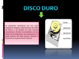 Este documento describe los principales componentes de un disco duro, incluyendo los platos, las cabezas de lectura/escritura, el actuador, el motor, la placa lógica y la carcasa. Explica que los platos giran a alta velocidad y contienen múltiples pistas magnéticas concéntricas organizadas en cilindros, y que las cabezas leen y escriben datos en sectores de 512 bytes. También resume las principales métricas de rendimiento de un disco duro como el tiempo de acceso medio